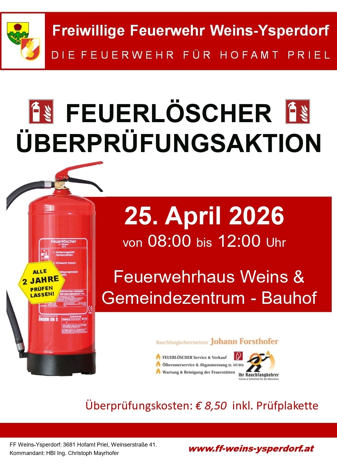 Am Samstag, den 25. April 2026, findet von 08:00 bis 12:00 Uhr eine Feuerlöscherüberprüfung statt.